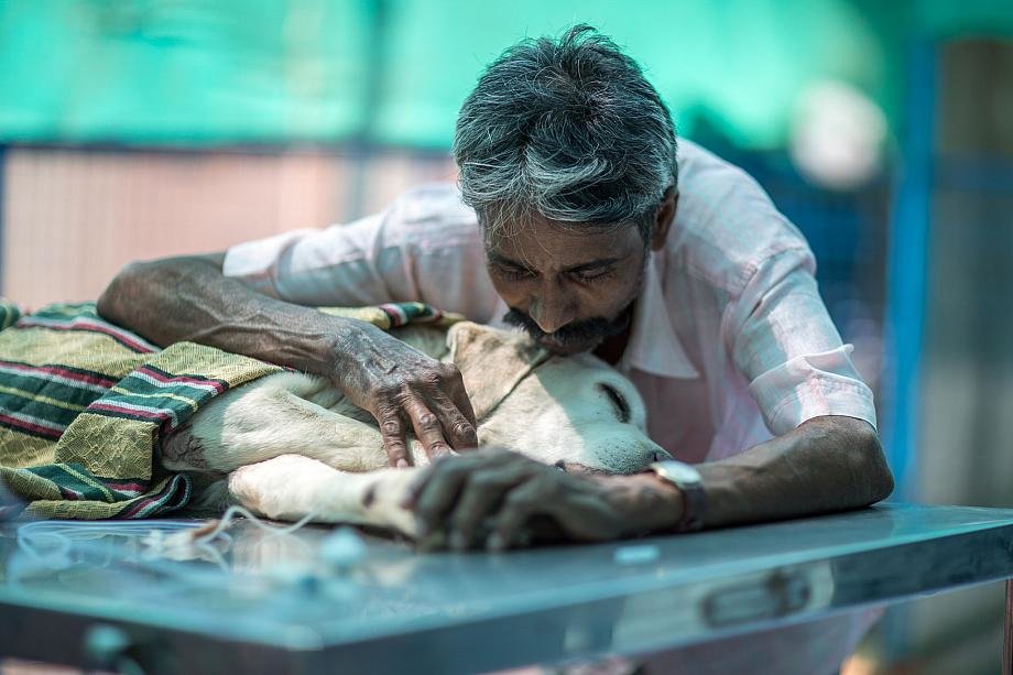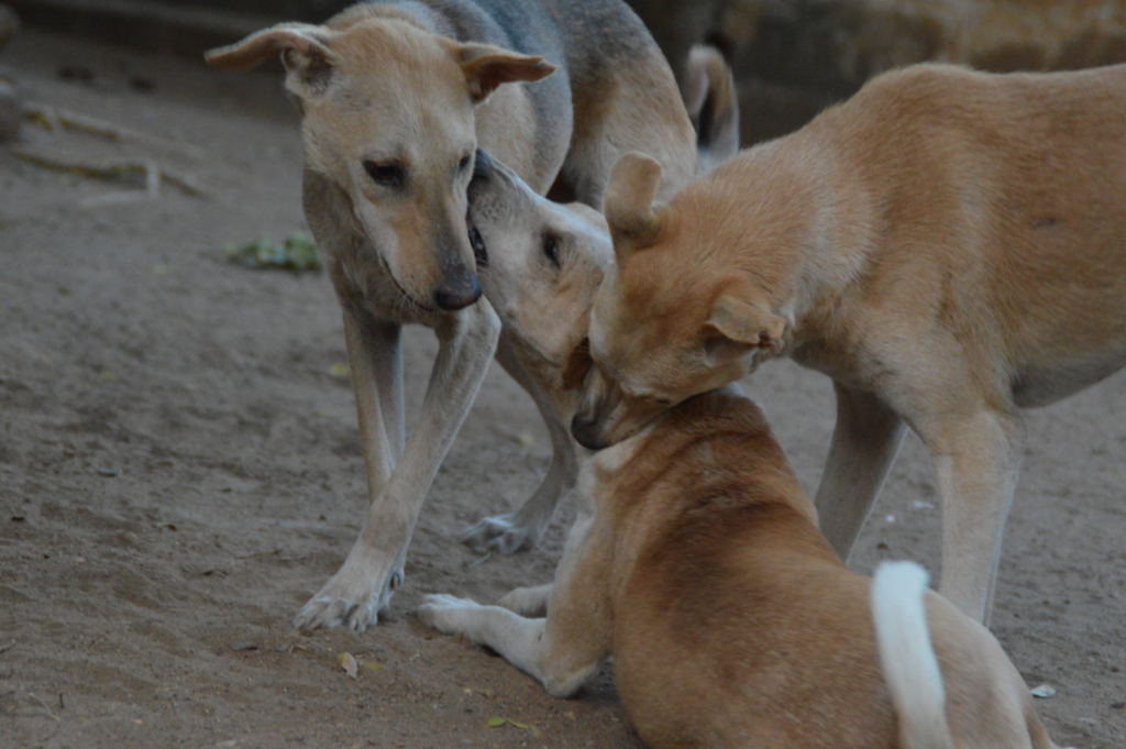 - We received a call from a village 65 kms away. A dog with a horrible infected wound on its back leg was going to houses for food and being chased away because he smelled so bad. People in one house tried to kill him…Vishwa got there about 10am. Just outside of town there was a large, wooded area, making it difficult to find the dog. Ten village people helped Vishwa look for him all day and couldn’t find him…Finally, Vishwa left around 6pm, when it was starting to get dark. The next day he returned at 9:30am with Prem Kumar and Arunagiri. They looked until 5p and gave up…The third day, Vishwa took our beloved Pandi with him, leaving Tiru at 4:30a. They got there at 6am. At 8 o’clock, they found out that the dog in question usually turned up at a particular house between 8 and 10. They waited, finally spotted him, chased him down and caught him…He had hundreds of maggots in the wound. Scores fell off in the car….Dr.Raja said he was weak, depleted, anemic, and in pain. He gave the dog a painkiller and i.v. with neurobion for nutrition, and tended the wound. The poor babe was only five years old. We’ve had him for five weeks, now. His wound is almost fully healed. He’s regained his strength, and has several furry friends with whom he wrestles, rests, and sleeps. He’s doing beautifully, and in two weeks Vishwa will take him back to his territory.