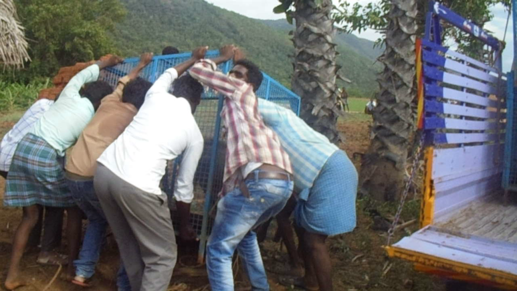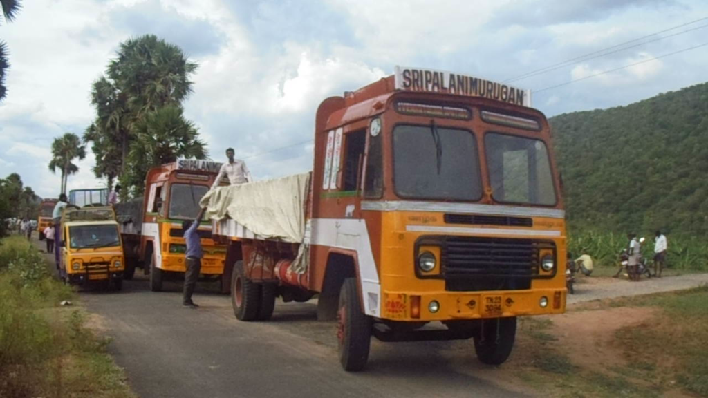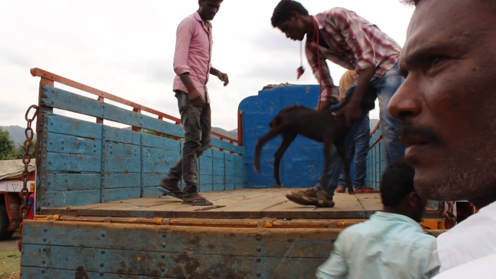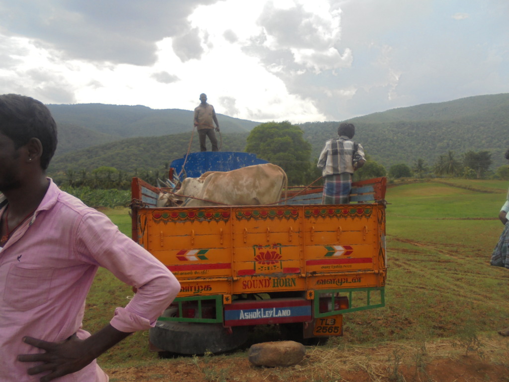 And unbelievably, early Thursday morning Vishwa was set to move. Four very large lorries with drivers, and a small sized one with three large cages for the pigs. And Vishwa, of course, to hands on orchestrate the whole thing, plus six carefully selected men to catch and load. (Included were Pandi, Venkatesh, and Prem Kumar from our Staff.)