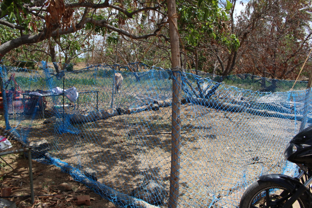 In the meantime the goats had been unloaded in their place about 25 kms away. There were five caretakers there. The goats had been given water when they arrived, but nothing else. It was too late to arrange anything. The caretakers were encircling them, keeping them together, waiting for Vishwa, who showed up somewhat before 10pm. He set up a temporary net enclosure, and the goats were settled in for the night. In the morning he built a “permanent” net enclosure (see the photos, below), reduced the caretakers to three, and the Sweeties (they really are gentle, vulnerable creatures) were taken for extended foraging, which they loved. The following day, oil cakes and peanut plants, both of which are favorites, were added to their diet.