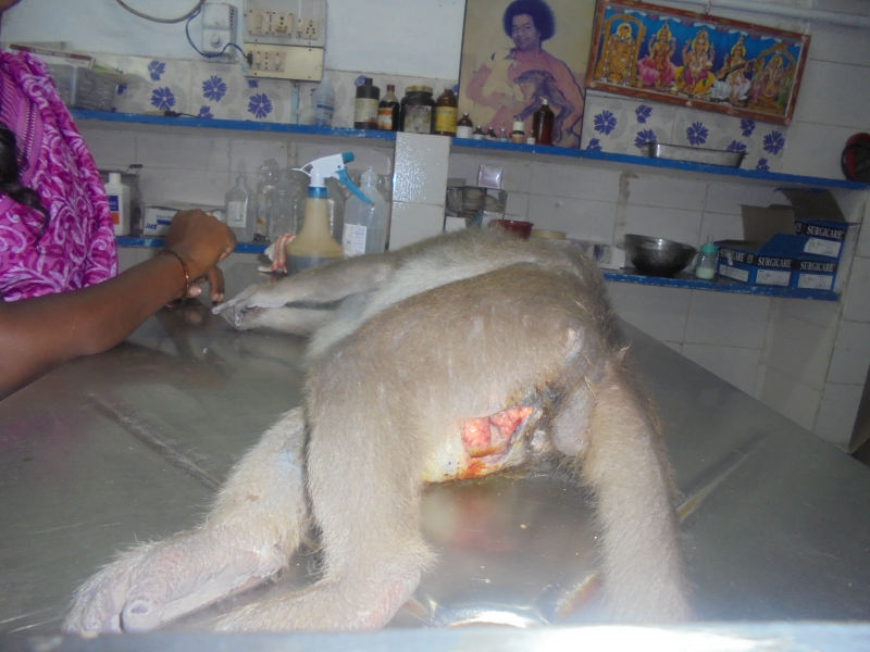 The tissue hanging was a covering from her stomach and came out below the anus. The poor honey had apparently been in a fight. Probably protecting her little one. The operation took a half hour. Dr. Bharati was on at the time. It wasn’t a severe wound. He stuffed the tissue back in and sutured it. The video below is post-op.