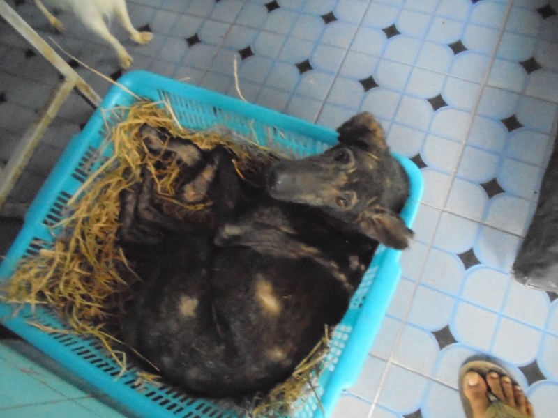 Pandi and Prem went out to get her. She’d been hit by a vehicle the day before. No one knew whether it was a car or two wheeler. She was two years old, her back was broken, and she had four healthy pups. They were two weeks old.