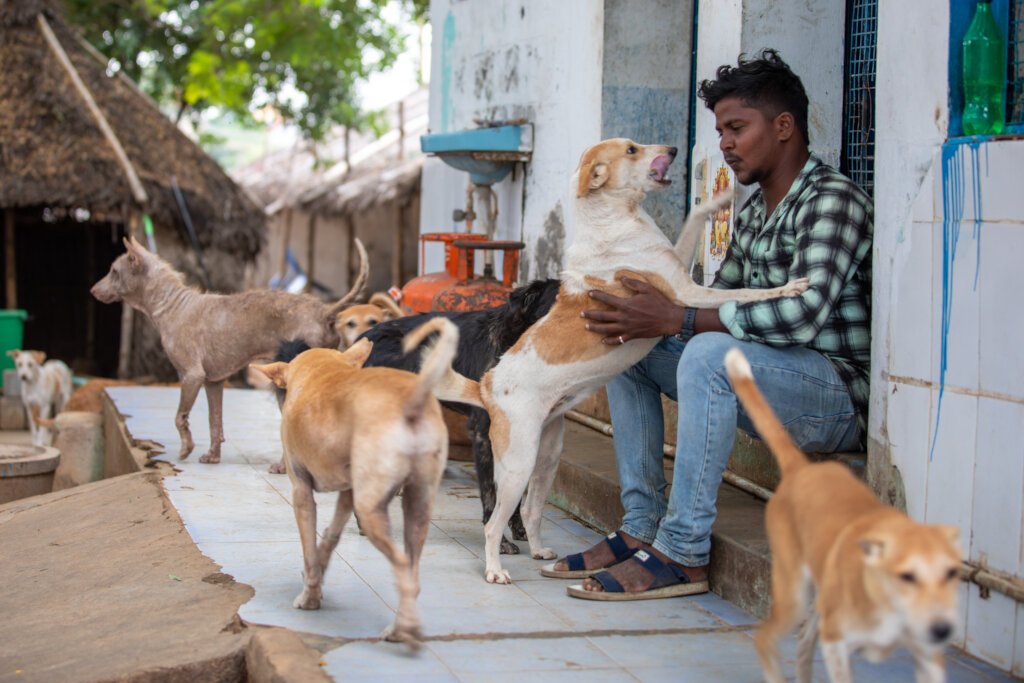 - A young dog in trouble...A late night call from Vellore, 100 kms away. Vishwa got there at 10:30pm. It was a dog with a large wound on his head the size of a hand. He was fast and clever. He would take Pedigree and cookies, but if Vishwa got too close, he'd take off, jump fences and run around corners. It took two hours to catch him. The poor babe was only 7 months old. The wound had hundreds of maggots with pus coming out of it, and smelled horrible. It took two months to heal. He gained weight, and his energy came back. He played a lot with another dog (a cute female... hmm!). But he was very happy when we released him back into his territory...Om Namah Shivaya.