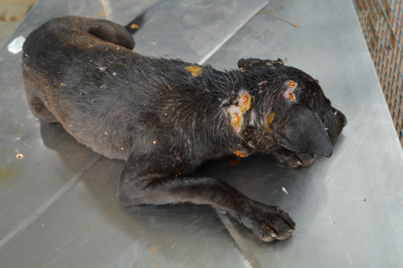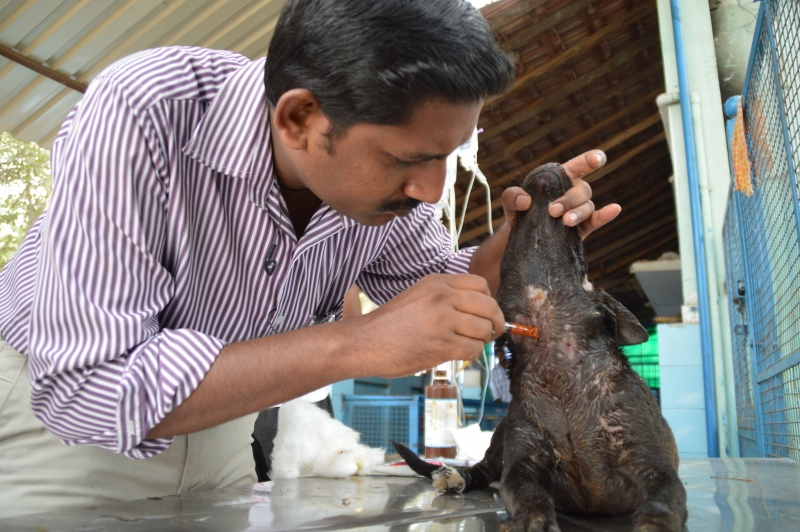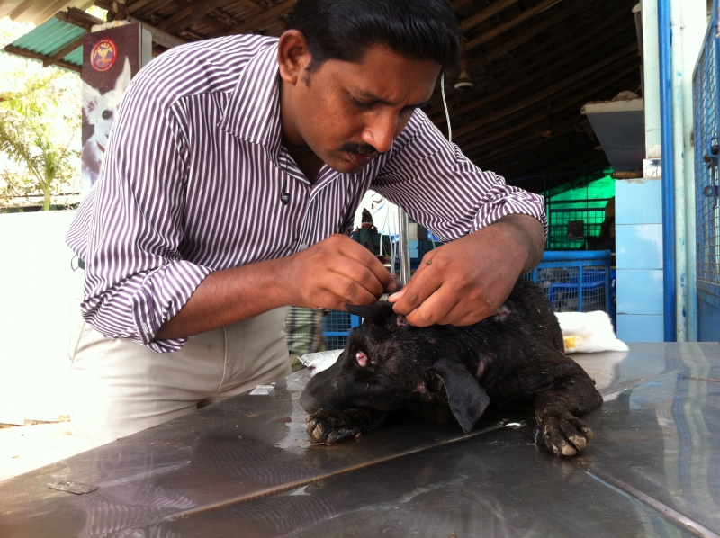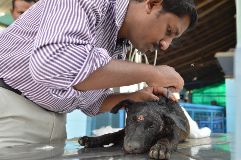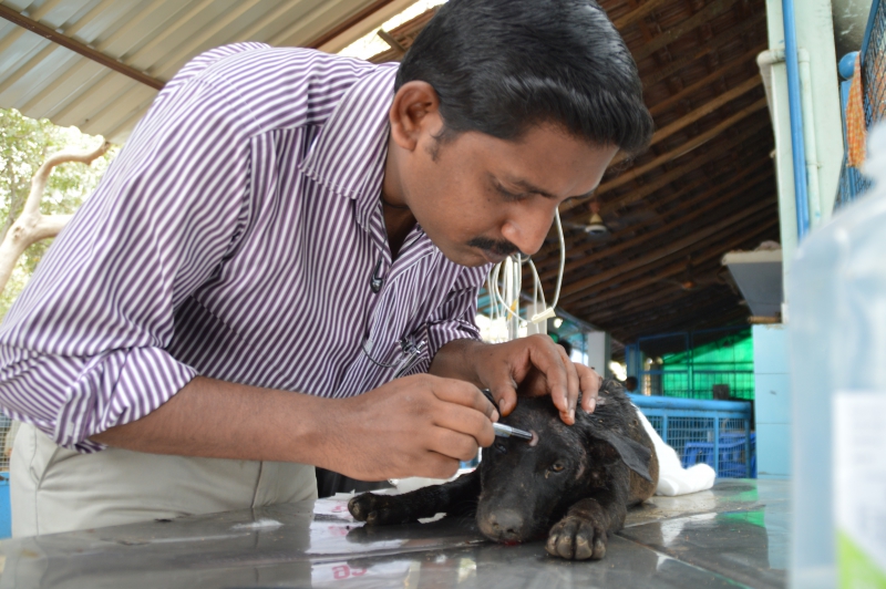The reason I’m interested in you seeing this case is that we have four photos that show the incredible gentleness of our beloved Dr. Raja and how trustingly the poor guy surrenders to his care. ( We don’t have a video, but he got a pain killer.anti-biotic injections, and anti-rabies vaccine. It’s truly amazing how the creatures don’t even feel the injections given by Dr. Raja)