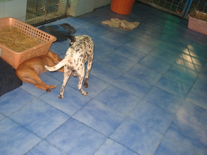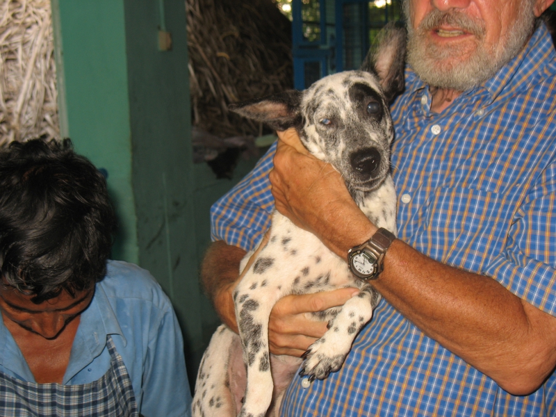 We put her in the pre-op room off the veranda. To keep her in the room we put a 2 ½ foot high board across the gate leading to the veranda. Two or three young puppies were placed with her so that she’d have company and could snuggle when she slept. As with most of the dogs in these stories, she was showered with affection. And there she stayed for over a month. Her strength and confidence slowly built, and she came to know where all the objects were. She’d race in really tight circles without going anywhere. I thought she did it because that way she wouldn’t run into anything. Dr. Raja thought it was an emotional problem. Who really knows? (Just thought of a great animal psychic in Mount Shasta California who would actually know).