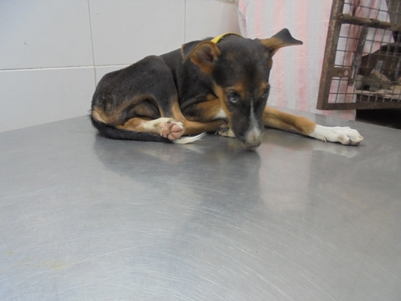 Dr. Raja operated the next day. The photo below is post op, and he’s unhappy. His owner’s not there. Outside the purview of the photo, though, “pure Heart” supervisor Raja gave him a lot of cuddling and love.