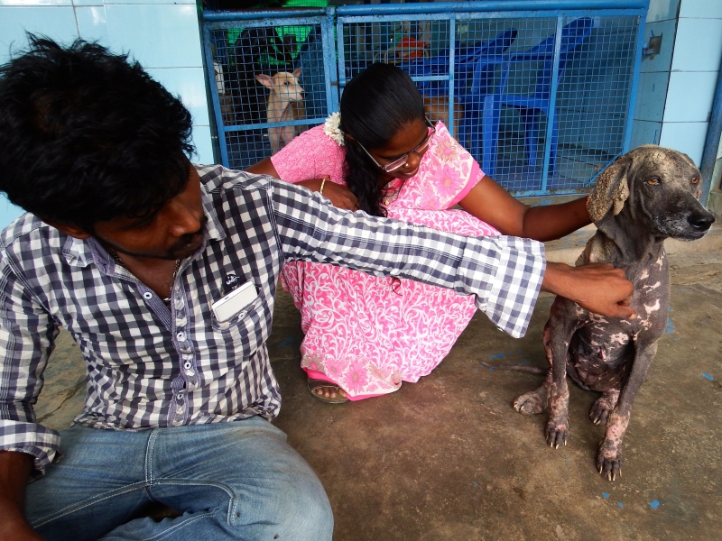 Aloof from Suguna and Vishwa Aloof from other dogs After two weeks when the scabies was healed she was put on the veranda for four days, still not responding to other dogs. Pureheart Sekar with the soft cow eyes gave her caring and love. I think even snakes and frogs would respond to Sekar. But she remained aloof.