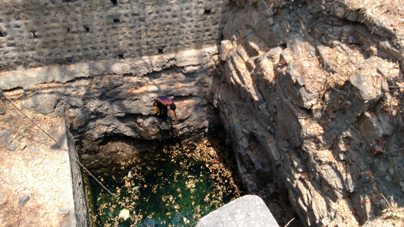 Unfortunately, we don't have a good video. Just the photos. But you can see it’s a long way down. After making his way to her, Pandi brought her up on the rope you see him climbing.