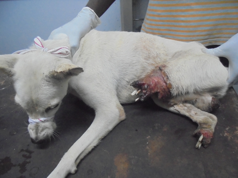 He was an “owner dog”-- about a year old. And the owner brought him to us during the day. Dr. Raja wasn’t here at the time, and Dr.Bharati treated him. (Dr.Bharati’s post grad work, like Dr.Raja’s, is in surgery. But surgery wasn’t needed.) He cleaned the wounds. Gave him a strong painkiller injection which effectively masked the pain, a steroid injection for shock, and thru an i.v. drip—nutrition and anti-biotics.